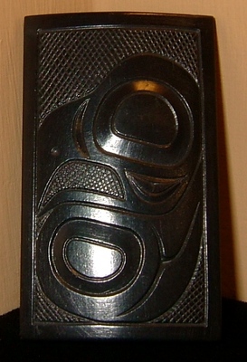 Haida carver, Pat Dixon was born on the Queen Charlotte Islands in the village of Skidegate in 1938. Pat showed amazing technical skill early on in carving where his love of the medium of Argillite became apparent. He moved to Vancouver in 1966 where he established a working relationship with fellow Haida carver Pat McGuire. Dixon acknowledges McGuire's influence, but suggests that it should not be overemphasized. He credits the positive affects of Bill Holm's book Northwest Coast Indian Art on his understanding of flat design. Pat Dixon works of the late 1960's and early 1970s are revered as some of the finest pieces of Argillite to come from the productive genius of himself, and master McGuire's minds. Over the years he has produced many model poles, pendants and broaches.