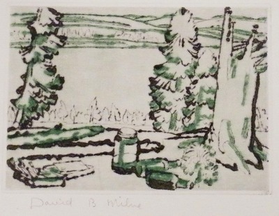 Throughout his life Milne sought the peace and solitude of a rural life. In his paintings, Milne explored different viewpoints. He greatly admired the work of Tom Thomson but had little interest in the nationalistic approach of the Group of Seven. His themes range from landscapes to views of towns and cities, still lifes and imaginary subjects. His experiments with different media and changing viewpoints show his interest in the process of painting itself. In 1929, Milne returned to settle permanently in Canada, stopping for brief periods in Temagami, Weston, and Palgrave. He built a secluded cabin at Six Mile Lake, north of Orillia, and spent the next six years painting, for the most part alone. Milne was interested in 'pure' painting, in "adventures in shape, colour, texture and space" as he called his watercolours of the 1930s and 1940s. The change from the less vibrant drybrush "adventures" to the fantasy watercolours is often attributed to the birth of his only child, David Jr., born to Milne's second wife when Milne was sixty. His young son encouraged him to adopt a new, vibrant and often whimsical approach to his art. Milne spent the rest of his life in Uxbridge, north of Toronto, exploring the Haliburton and Bancroft areas as well as the city of Toronto.
